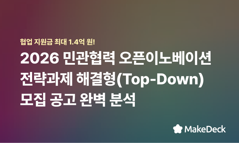 ํ์ ์ง์๊ธ ์ต๋ 1.4์ต ์๊ณผ ๋ยท์ค๊ฒฌ๊ธฐ์ ํ์ ์ ๊ธฐํ! 2026๋ ๋ฏผ๊ดํ๋ ฅ ์คํ์ด๋ ธ๋ฒ ์ด์ ์ง์์ฌ์ ๋ชจ์ง์ด ์์๋์์ต๋๋ค. ๊ฐ์ฅ ๋จผ์ ํฌ๋ฌธ์ ์ฐ '์ ๋ต๊ณผ์ ํด๊ฒฐํ(Top-Down)'์ ์ด 25๊ฐ์ ์์๊ธฐ์ ์ด ์ฐธ์ฌํ์ฌ 30๊ฐ์ ํต์ฌ ์ ๋ต ๊ณผ์ ๋ฅผ ๋ด๋์์ต๋๋ค. ์ด๋ฒ ์ฌ์ ์ ๋จ์ํ ์๊ธ ์ง์์ ๋์ด ๊ตญ๋ด ์ ์ ๊ธฐ์ ๋ค๊ณผ์ PoC(์ค์ฆ) ๋ฐ ํ๋ก ๊ฐ์ฒ์ ๊ธฐํ๋ฅผ ๊ฑฐ๋จธ์ฅ ์ ์๋ ์ฌํด ์ต๊ณ ์ '์ค์ผ์ผ์ ๋๋ค๋'์ ๋๋ค. ์์๊ธฐ์ ์ด ์ ์ํ ๋์ ๋ฅผ ์ฐ๋ฆฌ ๊ธฐ์ ์ ๊ธฐ์ ๋ ฅ์ผ๋ก ํด๊ฒฐํ๊ณ ํ์ ์ ์ธ ์์ ๋ชจ๋ธ์ ๊ตฌ์ถํ ์ ์๋ ์ ํธ์ ์ฐฌ์ค์ธ๋ฐ์. ์ง๊ธ ๋ฐ๋ก ์ฐ๋ฆฌ ๊ธฐ์ ์ ์ค์ผ์ผ์ ์ ์ํ ๋ง์ถคํ ๊ณผ์ ๋ฅผ ํ์ธํ๊ณ , ๋ฉ์ดํฌ๋ฑ๊ณผ ํจ๊ป ์ ๋ต์ ์ธ ์ค๋น๋ฅผ ์์ํด๋ณด์ธ์!